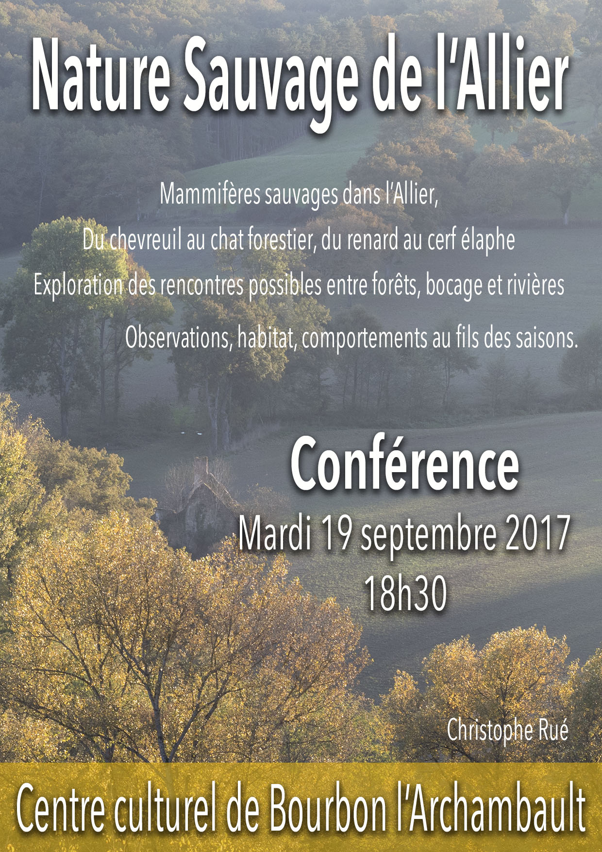 A l’invitation du Centre Culturel de BOURBON L’ARCHAMBAULT, j’ai le plaisir d’exposer du 5 au 23 septembre 2017 une série photographique qui vous propose un regard sur la faune sauvage de l’Allier, entre rivière, bocage, et forêt.
